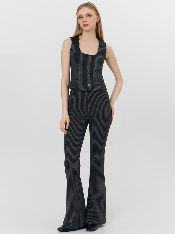 Прилегающий силуэт с центральной застежкой на пуговицы создает элегантный и собранный вид. Горловина и проймы аккуратно обработаны, что подчеркивает качество пошива. Жилет легко надеть поверх футболки, блузки или тонкого джемпера, добавляя образу структуру и динамику благодаря контрастной полоске.