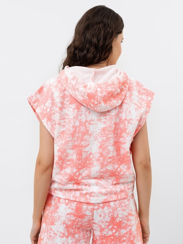 Стильная женская жилетка без рукавов свободного силуэта. Выполнена из легкого трикотажного футера. Вырез круглый, с просторным капюшоном, который спереди идет внахлест. Есть удобный карман-кенгуру. Рекомендуем для нетривиальных городских образов!